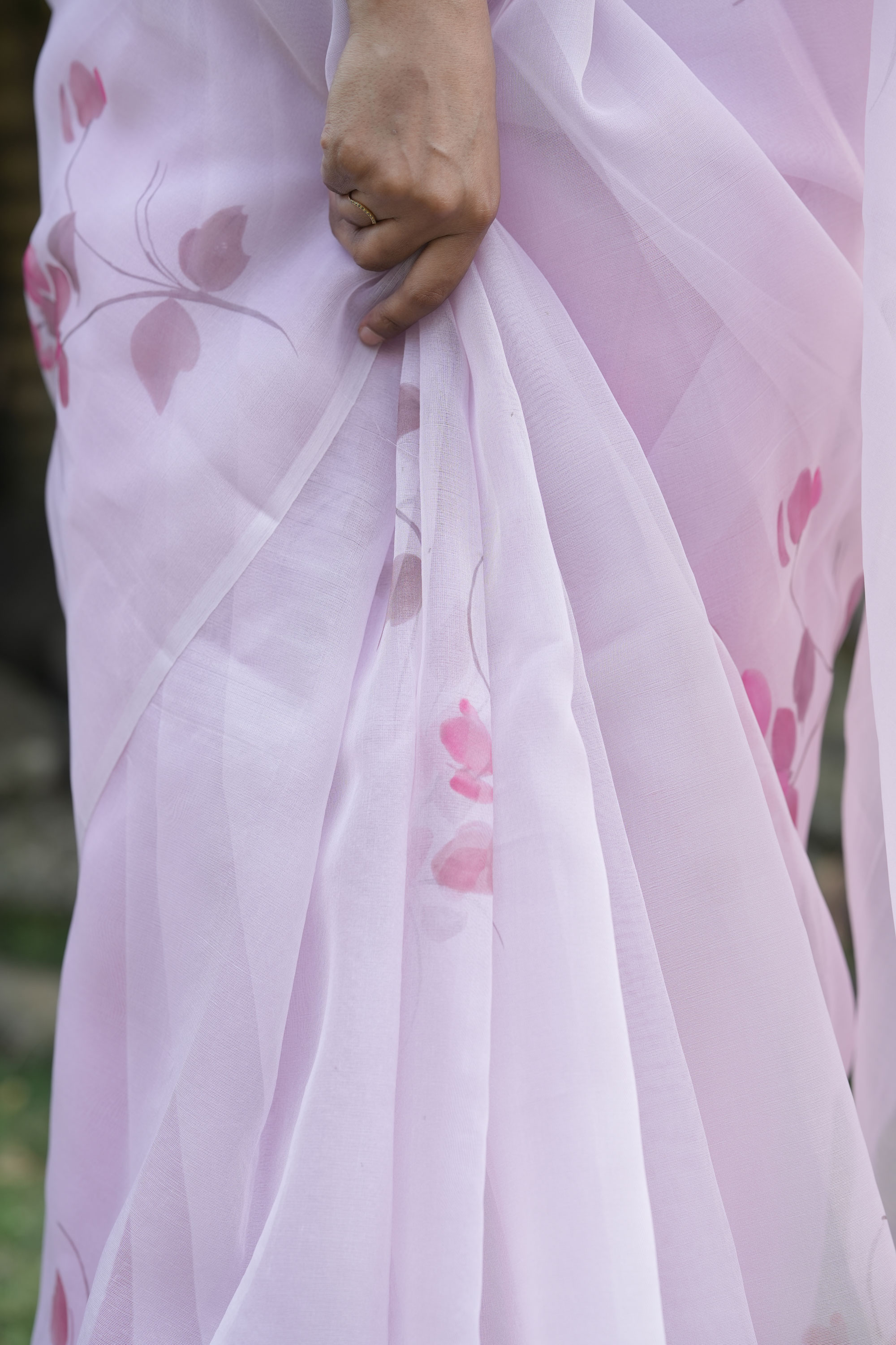 Graceful and effortlessly elegant, this blush pink organza saree features delicate floral prints that bring a soft feminine charm to your wardrobe. Lightweight and beautifully sheer, it drapes with ease, making it perfect for daytime celebrations and elegant gatherings.